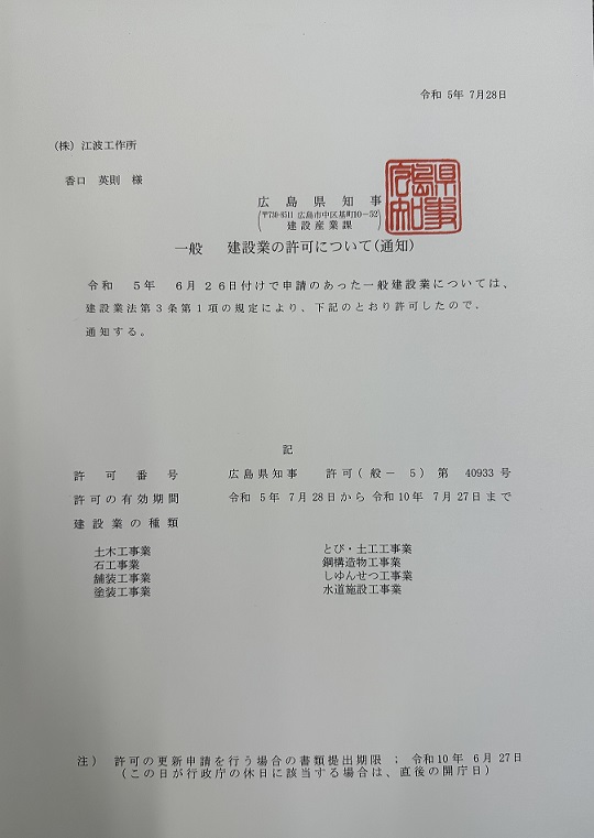 許可番号 広島県知事 許可(般ー5)第 40933号
